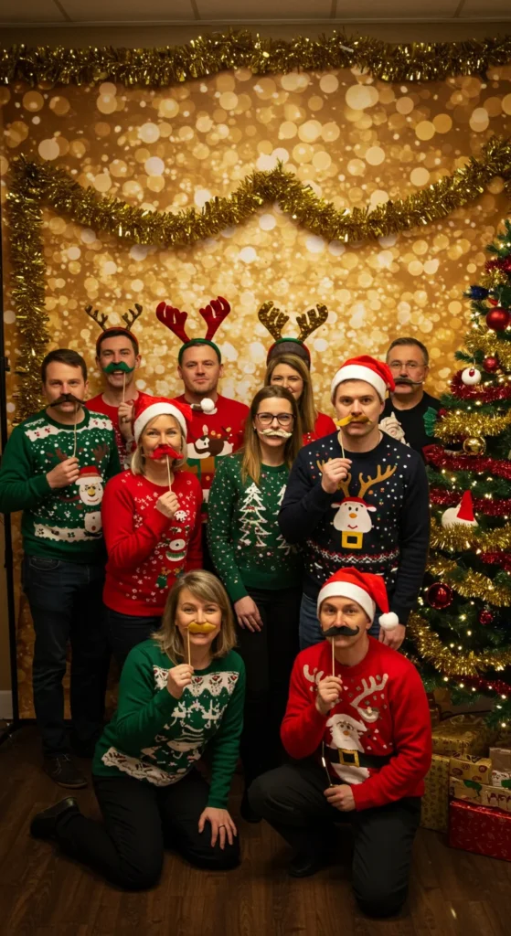 Create a DIY photo booth using wrapping paper as a backdrop and props like oversized candy canes and Santa hats. Add a ring light or good lighting for perfect shots. Guests love sharing their looks on social media, so make it Insta-worthy without spending much.