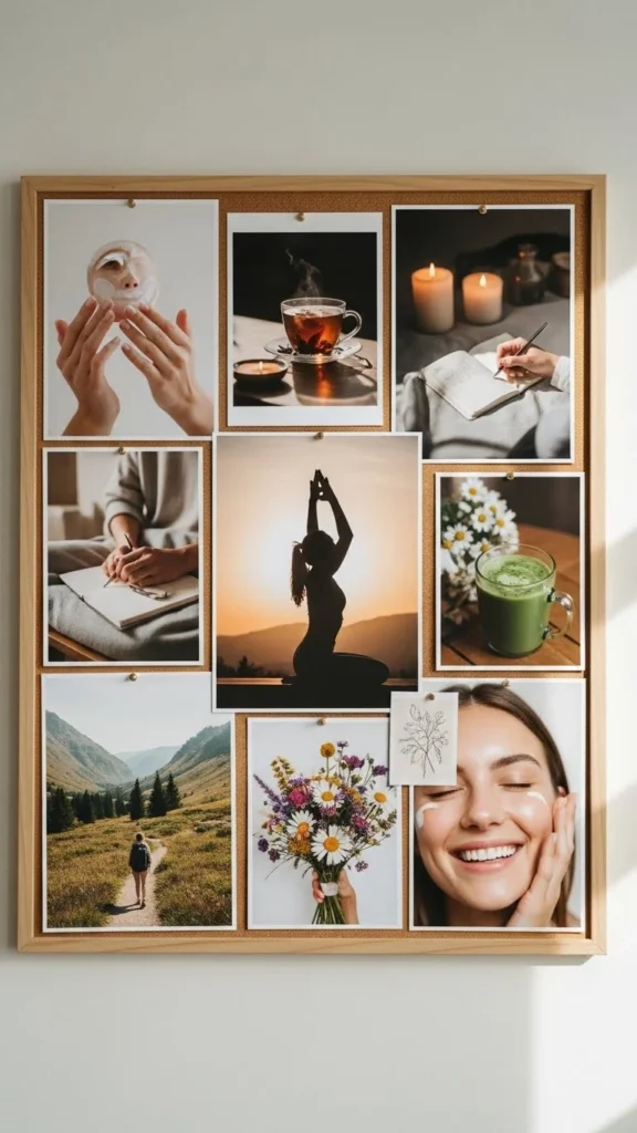 A wellness board helps you focus on habits that support your emotional and physical balance. Add visuals of clean meals, warm tea moments, peaceful poses, and nature views. Keep the palette soft so your brain connects the board with rest. This layout is ideal for mindfulness goals, sleep routines, or stress reduction. Simple craft supplies—twine, clips, or small dried leaves—add a natural touch.