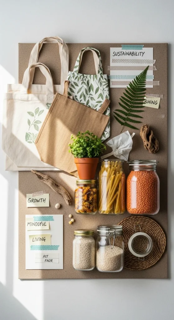 DIY tip: Use recycled cardboard. Add visuals of reusable items. Place it in your kitchen. This board supports gentle eco habits.