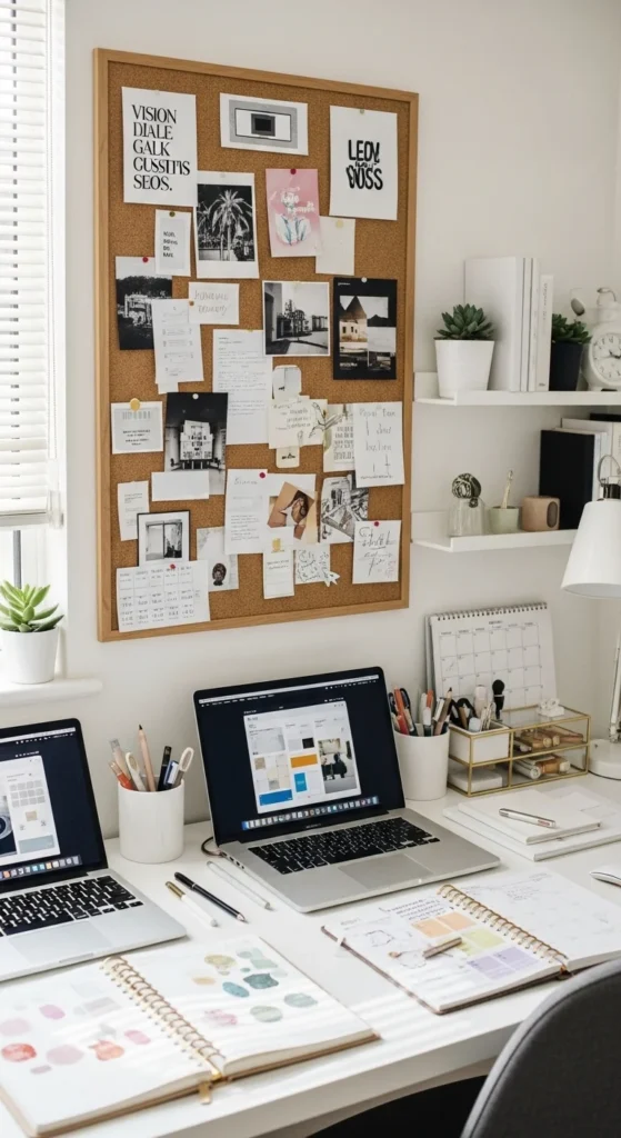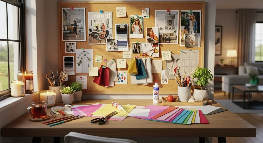 Add visuals of textures and palettes. Place it near your wardrobe. This board guides thoughtful shopping.