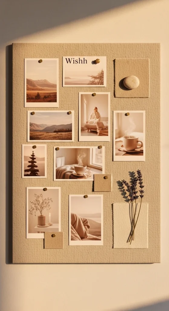 A neutral aesthetic brings clarity and peace. Choose images in cream, tan, and brown shades that reflect steadiness and simplicity. This style works well for grounding your intentions and keeping your board visually calming. Add photos of cozy corners, minimal outfits, tidy spaces, and slow-living scenes. Neutral tones help your board stay balanced and prevent overwhelm. You can also add natural textures like kraft paper or pressed leaves for depth. This type of board fits anyone wanting a soft, steady direction for 2026.