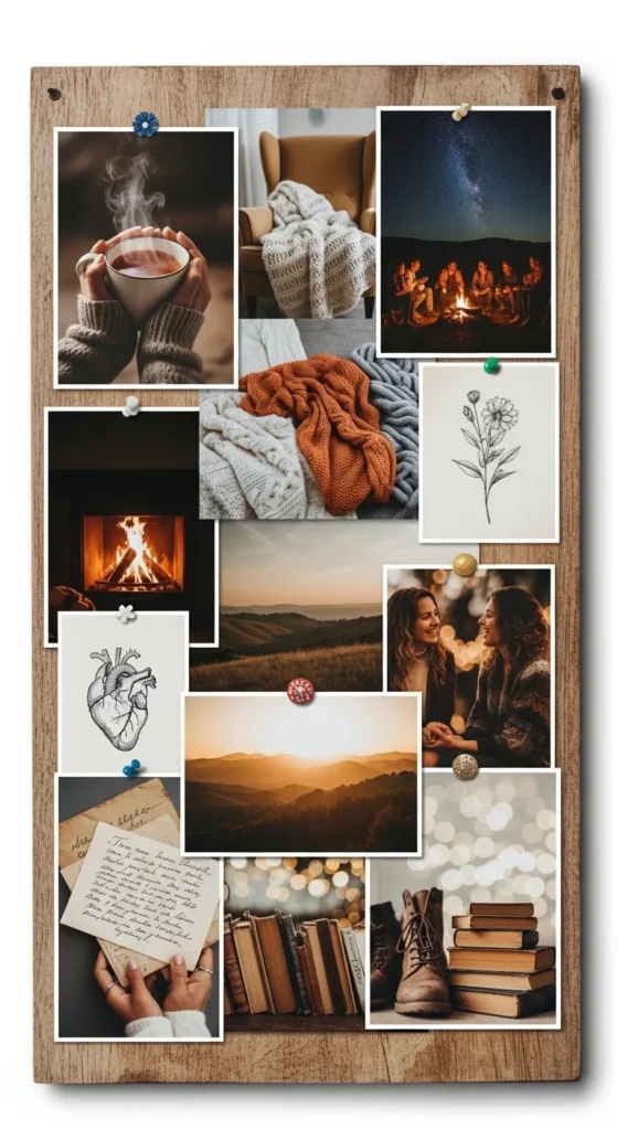 A glow-themed board uses warm oranges, golds, and soft lights. Include sunset views, candlelit moments, and gentle self-care imagery. This style works for emotional warmth, healing, and personal calm.