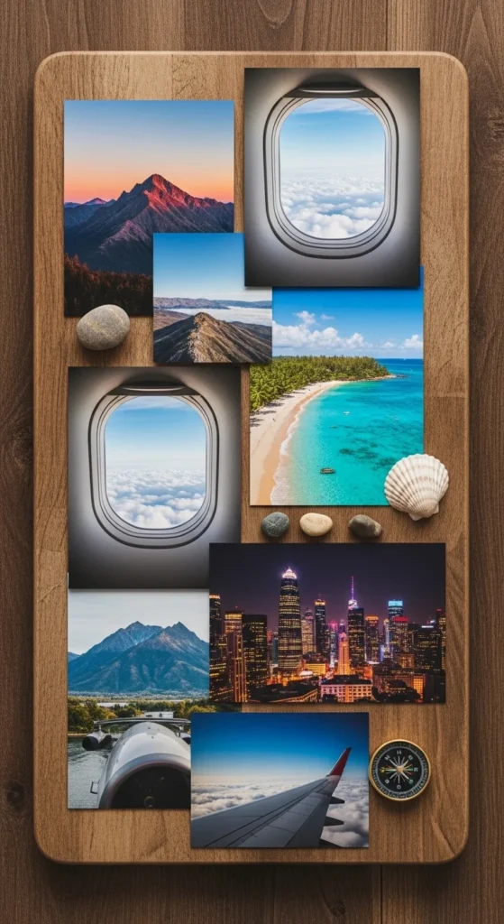 Use stunning visuals of places you dream about visiting—mountains, oceans, unique cities, or quiet villages. Add aesthetic travel symbols like passports, luggage, and sunrise flights. The board works as a motivator to save, plan, and stay excited. Keep your images balanced so the board feels inspiring rather than overwhelming.