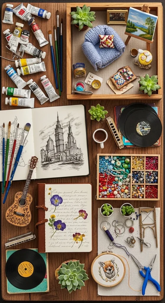 Encourage creativity with vibrant but harmonious visuals. Add images of art supplies, writing desks, photography scenes, or music corners. This board inspires playful expression throughout 2026. Use colorful tape or washi to make the board even more fun.