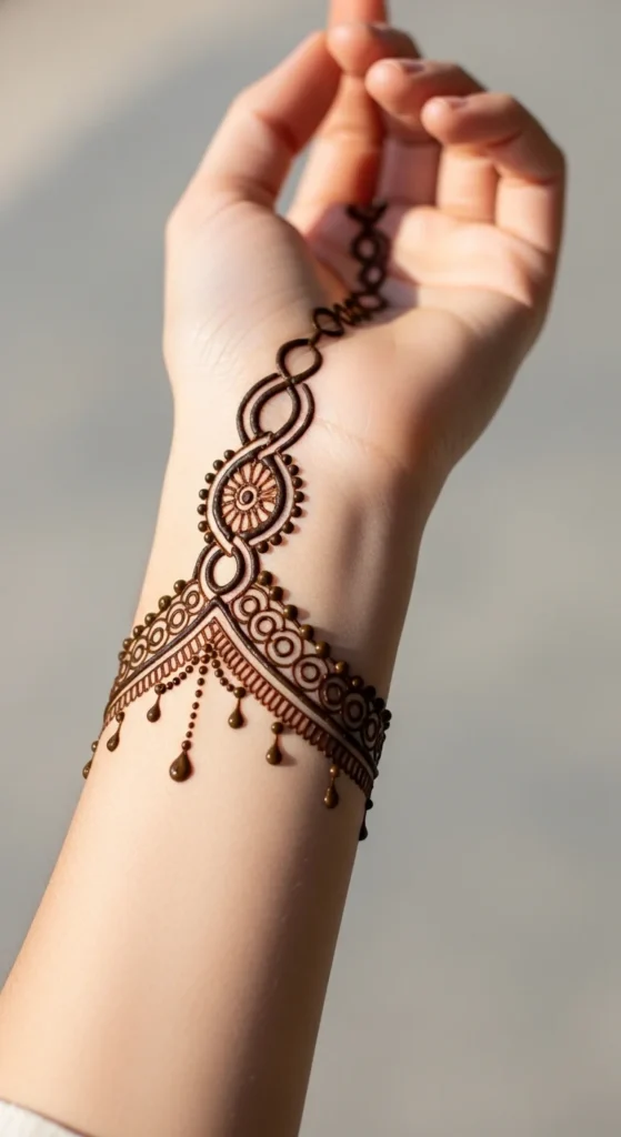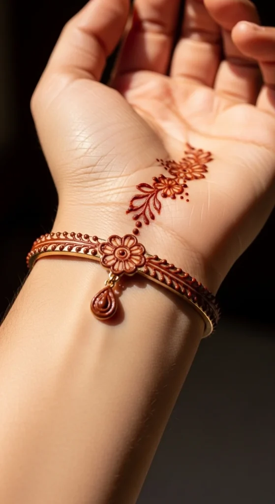A bracelet and charm drop mehndi design looks exactly like a delicate wrist accessory. The base is a thin band around the wrist, then one small hanging motif drops below it like a charm. That charm can be a flower, paisley, teardrop, lotus, or simple bead-like shape. This tiny hanging detail gives the pattern movement and makes it look more jewelry-inspired. It is a beautiful choice when you want mehndi that feels stylish but very light. Since the charm is the standout detail, the band itself can stay minimal with dots and fine lines only. This kind of mehndi looks lovely with sleeveless or short-sleeve outfits because the wrist remains visible. It also works well for quick festive applications and young bridesmaids who want something elegant but not bridal-heavy. The final look is neat, decorative, and feminine with very little effort.