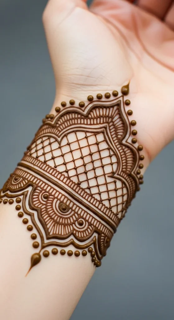 A slim jaali wrist panel brings texture to mehndi without making the whole wrist look heavy. Jaali patterns use fine net-like lines, and when kept in a narrow strip or small panel, they can look very elegant. This design works best when bordered by thin lines or soft florals so the panel feels framed. It is a good option for women who want a little more detail than plain dots or leaves but still prefer a delicate overall look. The net pattern should stay small and neat. If it becomes too wide, it can lose the lightness that makes it stylish. A slim jaali panel looks beautiful beside real bracelets because it gives the skin a lace-like texture. It suits festive wear and semi-formal events especially well. If you want a mehndi design that feels detailed, modern, and refined, a narrow jaali strip at the wrist is a very beautiful choice.