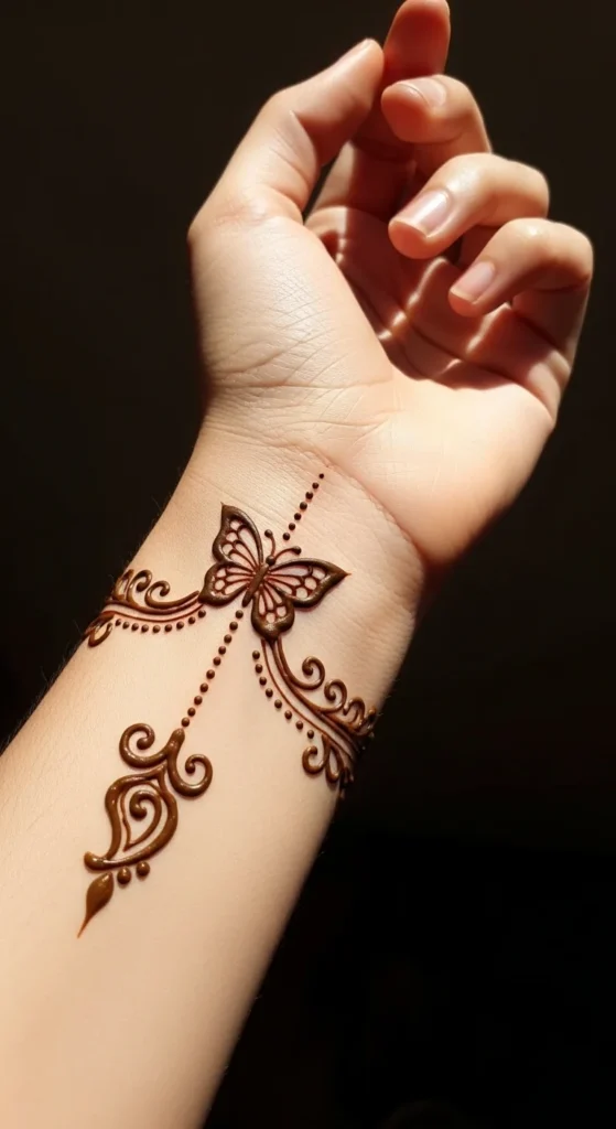 A butterfly wrist charm design is playful, delicate, and perfect for lighter mehndi looks. One small butterfly near the center or side of the wrist can become the focal point, with dot trails, mini leaves, or soft swirls around it. This style is especially good for younger girls, college events, or casual festive wear because it feels charming without looking too serious. The key is to keep the butterfly neat and not too large. A compact shape with clear wings looks much more elegant than a big crowded motif. This design works well with one slim band beneath it or as a floating charm-style pattern on open skin. It pairs beautifully with rings and slim bangles and gives the wrist a soft graceful finish. If you like mehndi that feels pretty, feminine, and slightly whimsical, a butterfly charm design is an easy and lovely option to try.
