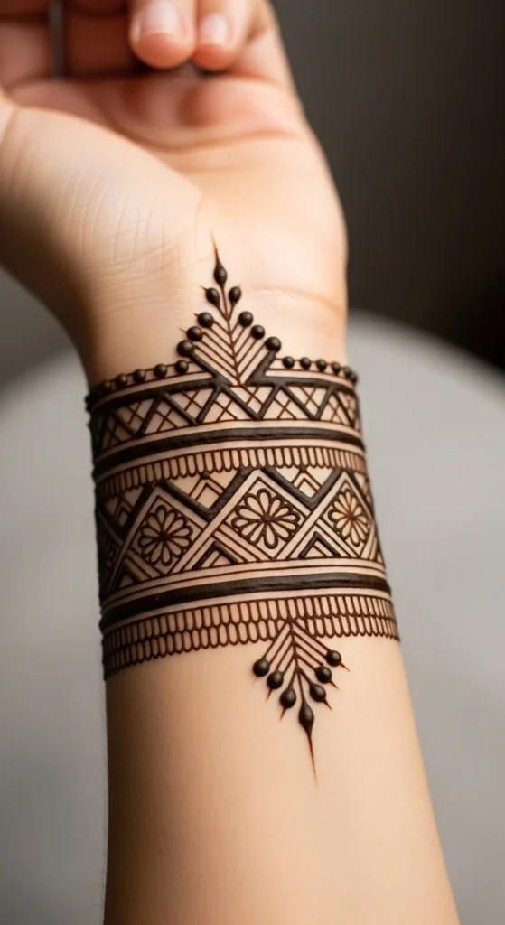A geometric wrist strip is ideal for anyone who prefers modern mehndi over floral or traditional-heavy styles. This pattern uses triangles, slim diamonds, line grids, and small repeated shapes to form a sleek band around the wrist. What makes it look stylish is the balance between precision and open space. If the shapes are too dense, the design can lose its delicate feel. But when the lines stay clean and the gaps stay visible, the result looks very contemporary. This kind of mehndi works beautifully with western wear, monochrome outfits, and people who prefer minimalist patterns. It can also be paired with a single ring trail for a slightly dressier finish. A geometric strip is often quicker to apply than floral work if the artist has steady cone control. It feels neat, structured, and different from the usual mehndi styles, which makes it a great option if you want something fashionable and slightly edgy.