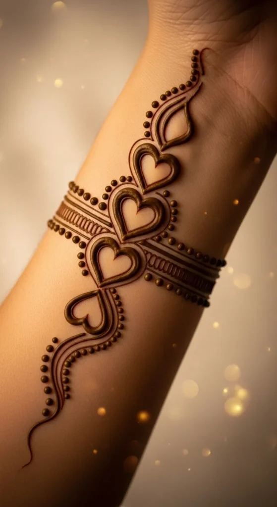A heart chain wrist mehndi is a sweet option that still looks very stylish when kept fine and simple. Tiny hearts joined together with dots or chain-like links can make the wrist look like it is wearing a delicate charm bracelet. This design is especially nice for younger girls, engagement functions, or soft romantic looks. The hearts should stay small so the pattern feels graceful instead of cartoon-like. You can keep them in one neat row or place one main heart in the center with lighter details around it. This is also a very easy design to personalize. Add initials, a tiny flower, or a ring trail if you want a slightly more decorative result. Because the motif is simple, it is quick to apply and works well when time is short. If you like mehndi that feels light, feminine, and pretty without being too traditional, a heart chain around the wrist is a lovely choice.