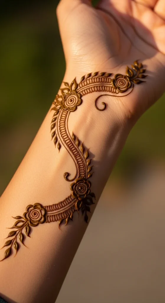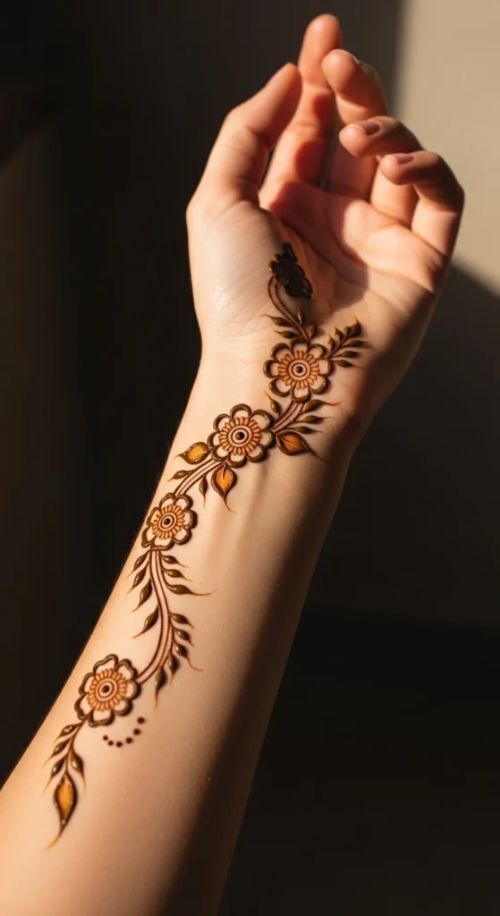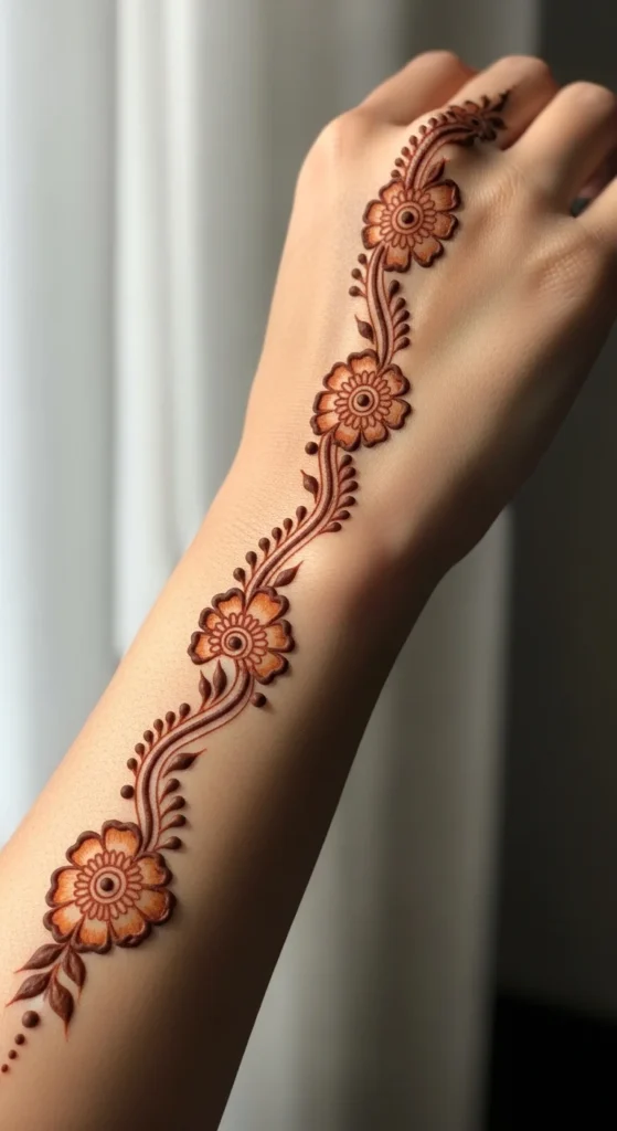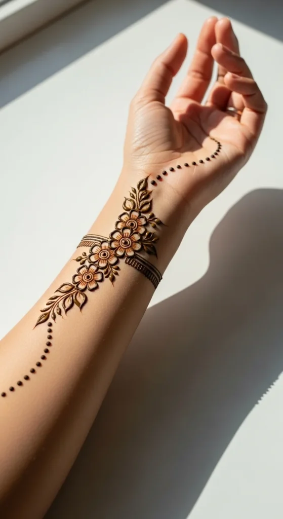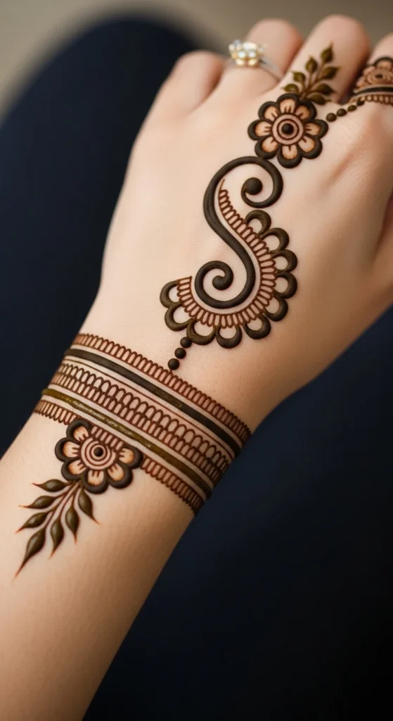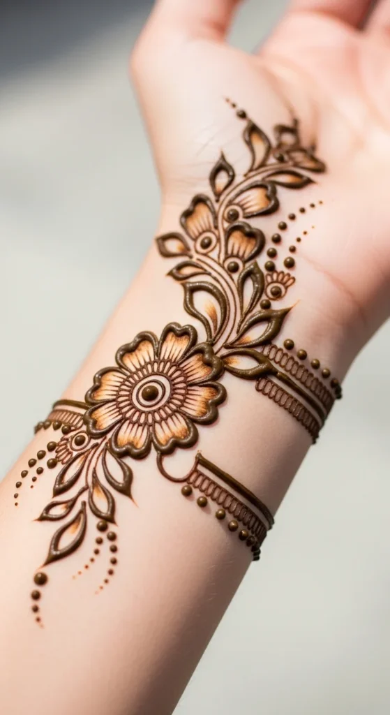 A single floral vine band gives the wrist a soft natural look that never feels overdone. One curved stem with tiny flowers and slim leaves can wrap around the wrist like a bracelet, creating a delicate design that suits almost any outfit. This is one of the easiest ways to get a graceful mehndi style without filling too much skin. You can keep the flowers tiny for a minimal result or make one bloom slightly larger as the focal point. The real beauty of this design is in its flow. Let the vine move gently rather than forcing stiff straight shapes. That makes the wrist look more elegant. This design is also budget friendly if you are getting mehndi done by someone else because it uses less time and less detail than a heavy cuff. It works beautifully for college events, family dinners, and simple festive dressing. If you like soft feminine henna that still feels stylish, a floral vine band is always a lovely idea.