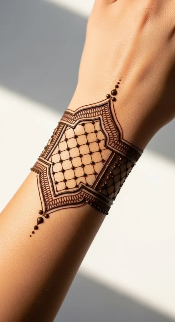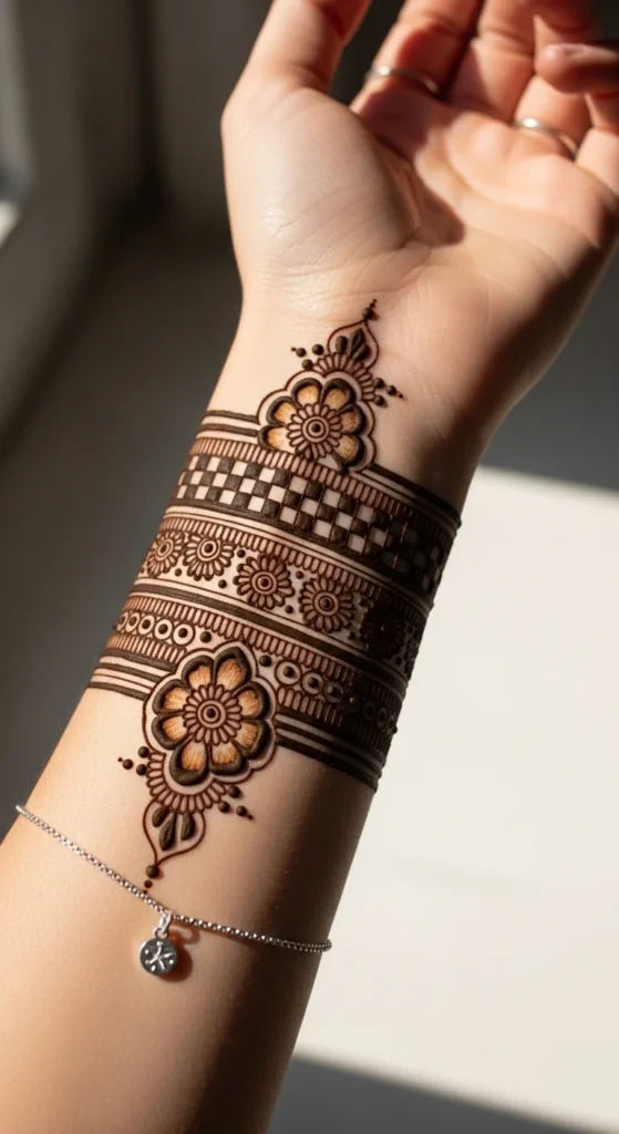 A checkered wrist accent is a bold idea made delicate through scale. Instead of making a large heavy grid, this design uses a very small checkered panel or strip near the wrist and softens it with tiny florals or dots nearby. The result feels fresh and modern while still staying wearable. This style is especially good for women who want something a little trend-forward rather than classic-only mehndi. The checkered part should stay small, because that contrast between structure and open skin is what keeps the design stylish. You can place the pattern in the center of the wrist like a panel or use it as one side detail in a cuff. It pairs nicely with minimal florals and slim bands so the grid does not look too hard. If you want mehndi that feels current, neat, and slightly edgy while still delicate, a checkered wrist accent can look very beautiful.