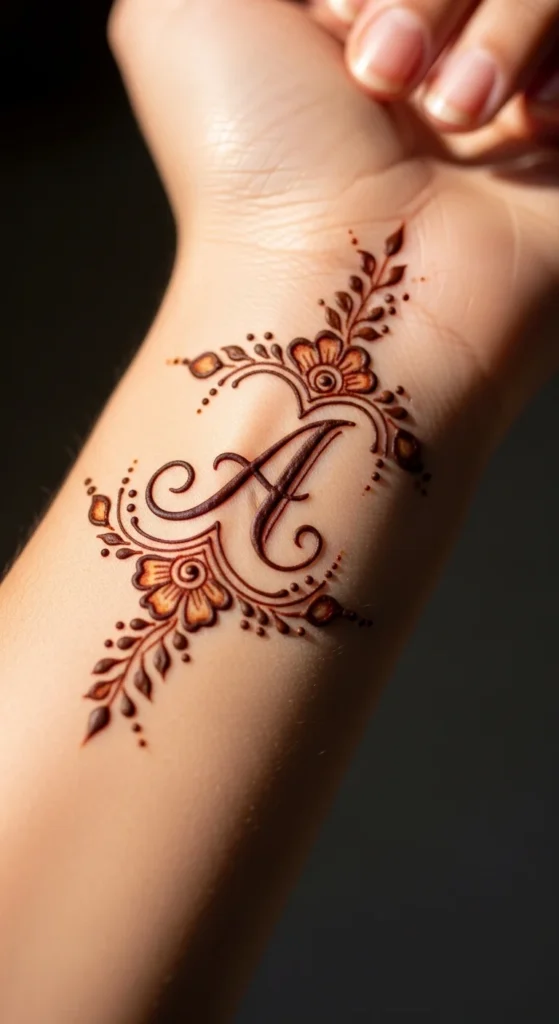 A name or initial wrist mehndi design makes the pattern feel personal while still staying subtle. A single initial in cursive or a tiny short name can sit at the center or side of the wrist, surrounded by small leaves, dots, or fine line details. This is a lovely style for engagement events, close family functions, or just a personal mehndi moment. The main trick is keeping the lettering simple and readable. Avoid making it too decorative, or the text may get lost once the mehndi darkens. This design works best when the letter becomes part of a slim bracelet layout rather than floating alone. It can also pair beautifully with hearts or florals if you want a softer finish. Because the pattern is so focused, it is usually quick to apply and does not need much product. It feels intimate, stylish, and different from standard motif-only designs.
