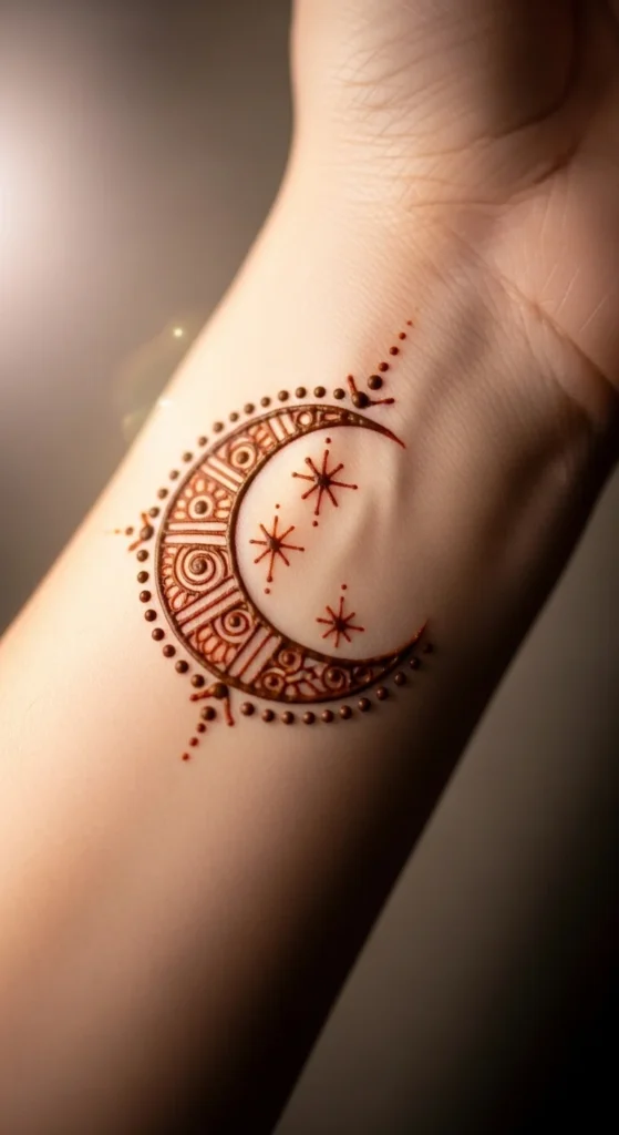 An inner wrist crescent design feels a little more personal and artistic than a top-wrist bracelet. A small crescent moon placed on the inner wrist with a few stars, dots, or tiny leaf curves around it can look incredibly stylish. Because the inner wrist area is smaller and more intimate, the design naturally feels delicate. This is a great option for girls who want something very light and symbolic rather than a full bracelet wrap. The crescent should stay thin and clean so it looks graceful instead of bold. It can be left alone or connected to a tiny side vine if you want a bit more detail. This kind of mehndi looks beautiful in close-up photos and feels very modern. If your taste leans minimal, dreamy, and slightly artistic, an inner wrist crescent is a lovely design to try.