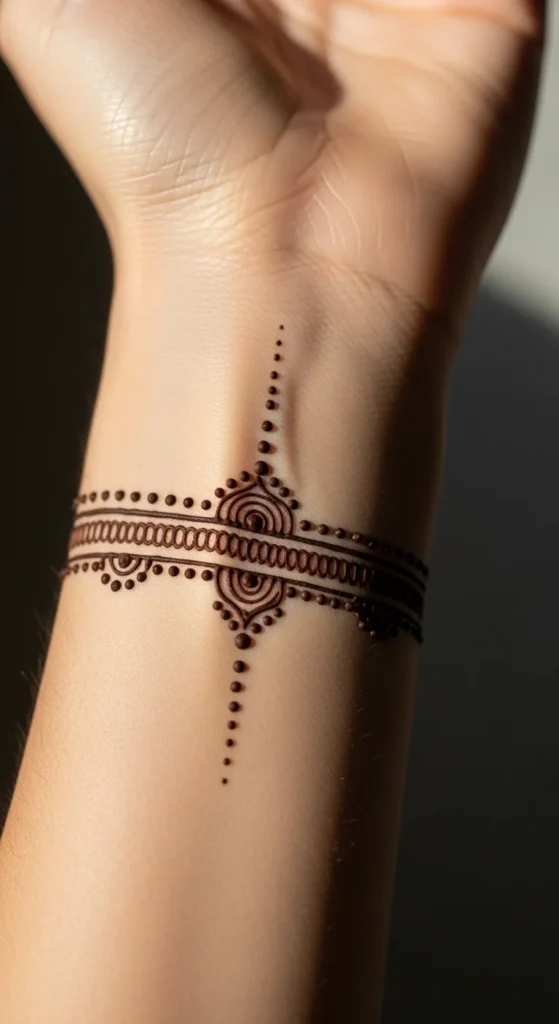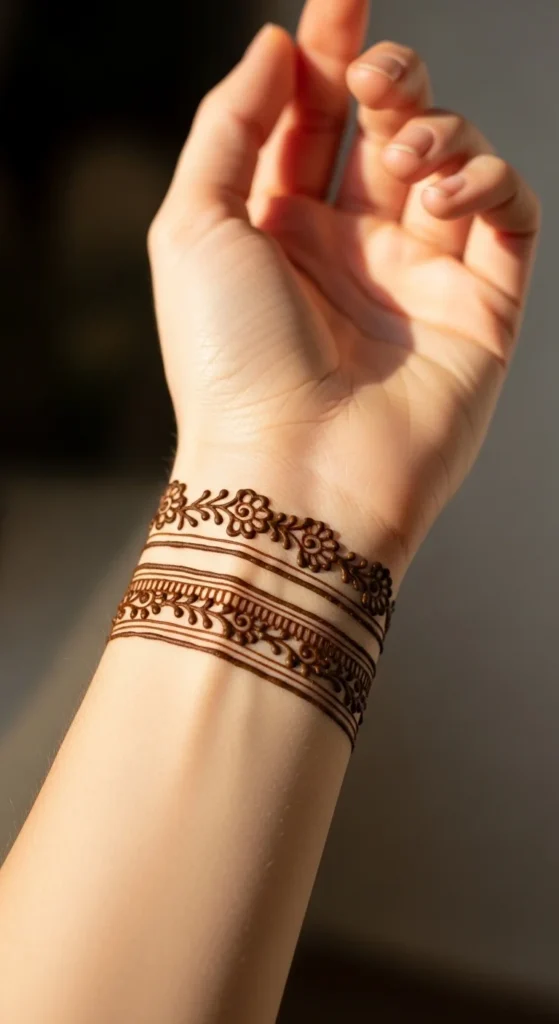 A twin band wrist design is clean, modern, and very easy to style. Two fine parallel lines circle the wrist, and the space between them can be left empty or filled lightly with dots, tiny flowers, or bead-like details. This layered bracelet effect makes the wrist look dressed without using a lot of pattern work. It is one of the best choices for women who like simple mehndi that still feels complete. The double line creates a stronger visual frame than a single bracelet, but because the lines stay thin, the design remains delicate. You can also place one small central motif between the bands for extra interest. This style pairs perfectly with western and eastern outfits alike and is especially useful when you want something quick yet polished. It feels neat, fashionable, and easy to wear.