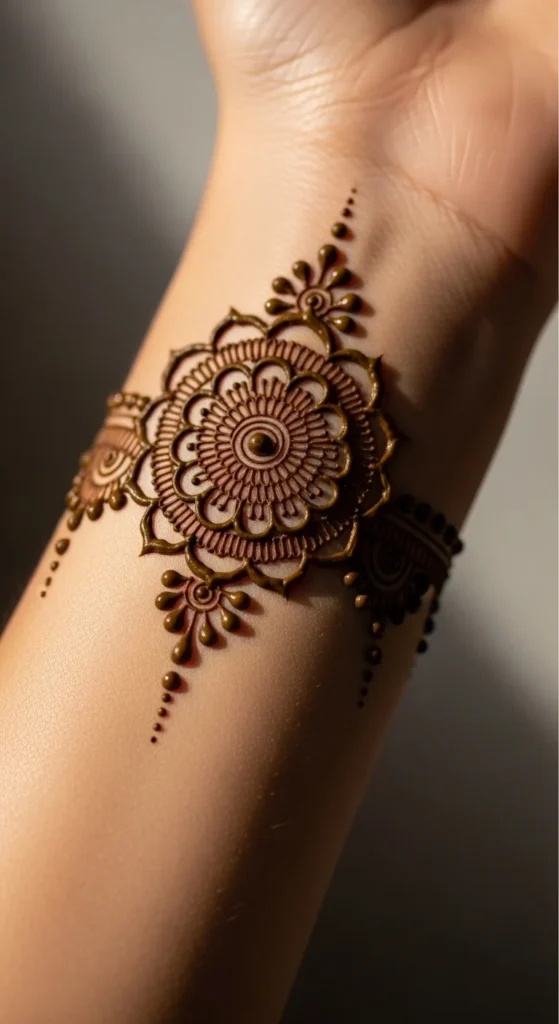 A mini mandala wrist cuff brings symmetry and structure to a delicate mehndi look. Instead of covering the whole hand, this design keeps the focus on a small circular mandala placed right at the center of the wrist, then builds a slim band around it. The result feels balanced and stylish, almost like a statement bracelet. This is a great option if you want something that looks complete from the front view of the hand. The mandala does most of the visual work, so the rest can stay light with dots, arches, and tiny leaf lines. This style suits both traditional and modern outfits because it has that classic mehndi feel without becoming too dense. It also photographs beautifully, especially when paired with rings or soft sleeves. If you are doing it yourself, draw the center first, then expand slowly with repeating petal shapes. Keep the outer band narrow so the design stays delicate. A mini mandala cuff feels timeless, graceful, and easy to love.