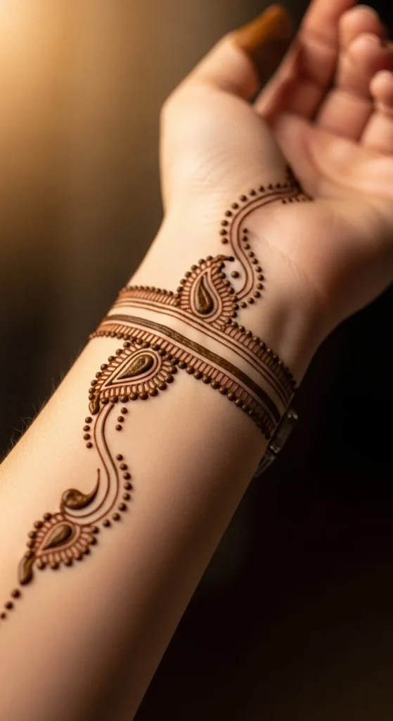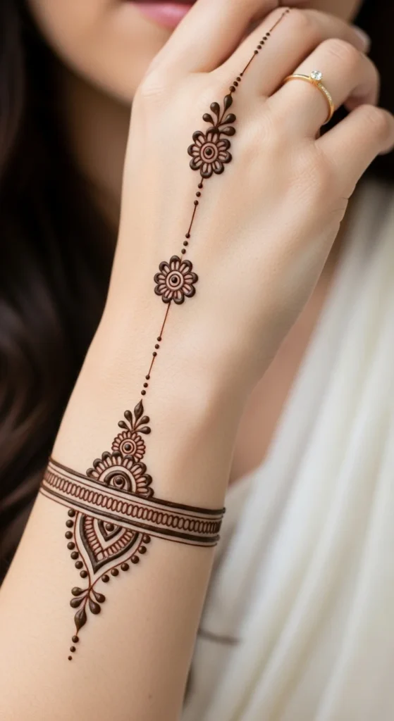 A vertical wrist-to-hand line design creates a very graceful elongated look. Instead of wrapping fully around the wrist, the mehndi begins at the wrist and moves upward in a narrow trail using tiny florals, paisleys, dots, or geometric shapes. This style is perfect if you want the wrist to stay central but still connect visually with the back of the hand. It is elegant, modern, and especially good for people who prefer slim layouts over circular cuffs. The beauty of this design comes from keeping the line narrow and letting the skin around it stay open. That makes the hand look longer and the whole pattern feel more refined. A vertical layout also works well for photographs because it guides the eye smoothly across the hand. If you want a mehndi style that feels artistic, soft, and slightly different from a typical bracelet pattern, this is a very stylish option to consider.