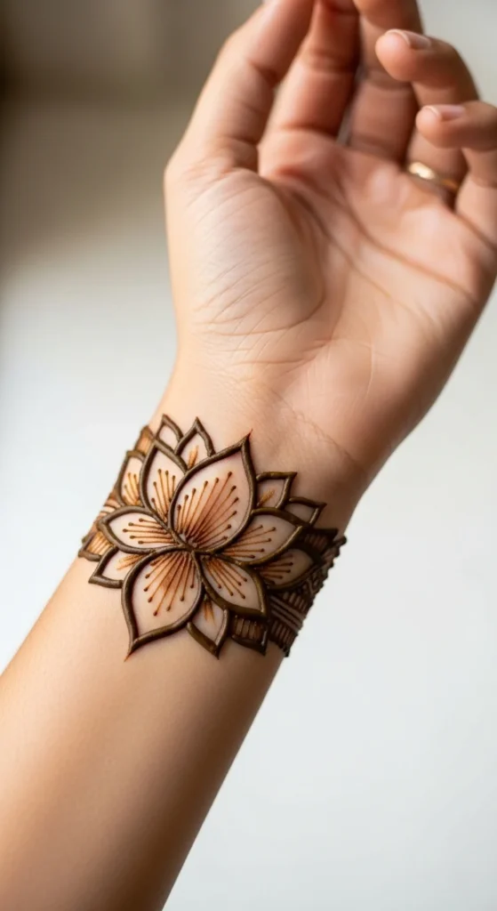 A lotus half cuff design gives the wrist a slightly artistic look while still staying delicate. The lotus can be placed on the inner or outer side of the wrist with open petals spreading upward or outward, while a light band or dot chain supports the rest of the pattern. This works especially well if you do not want a full wraparound cuff. The lotus becomes the main detail, and the open skin around it helps the design breathe. That balance makes it look modern and stylish. The petals can stay simple with linework only, or you can add tiny shading strokes if you want more depth. This design pairs beautifully with ethnic wear, festive kurtas, and soft pastel outfits. It also works well for someone who likes floral mehndi but wants something a bit more centered and symbolic. If done neatly, a lotus half cuff feels graceful, refined, and very pretty from every angle.