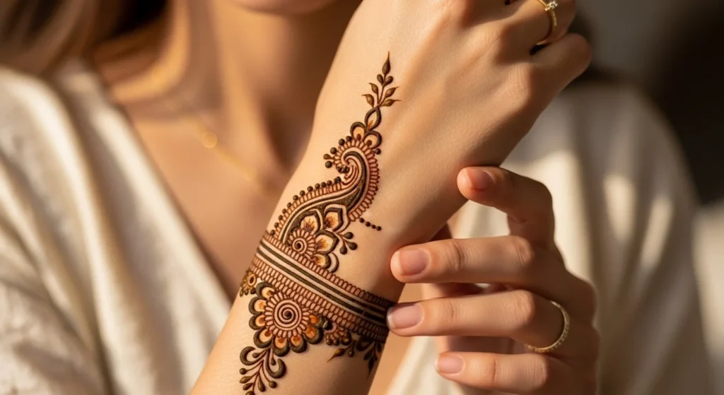 A fine leaf bracelet pattern is one of the simplest ways to make the wrist look stylish with mehndi. Tiny leaves placed along one or two slim lines can create the look of a graceful botanical bracelet. The design feels airy, natural, and very easy to pair with casual or festive outfits. This is also one of the easiest styles to customize. You can make the leaves longer and sharper for a cleaner modern look, or smaller and softer for something more feminine. The open skin between the leaves is what keeps the pattern delicate. Avoid filling every gap, and let the bracelet breathe. This mehndi style is good for beginners too because it builds from repeated leaf strokes rather than complex shapes. It looks beautiful on both the top and inner wrist and can be done quite quickly. If you want a wrist mehndi that feels fresh, neat, and softly elegant, a leaf bracelet is always a beautiful option.